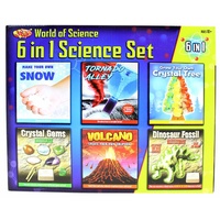 Make Your Own Snow, Tornado Alley, Crystal Gems Digging Kit, Volcano Eruption Kit, Grow Your Own Crystal Tree and Dinosaur Fossil Digging Kit with this World of Science 6 in 1 Science Set.